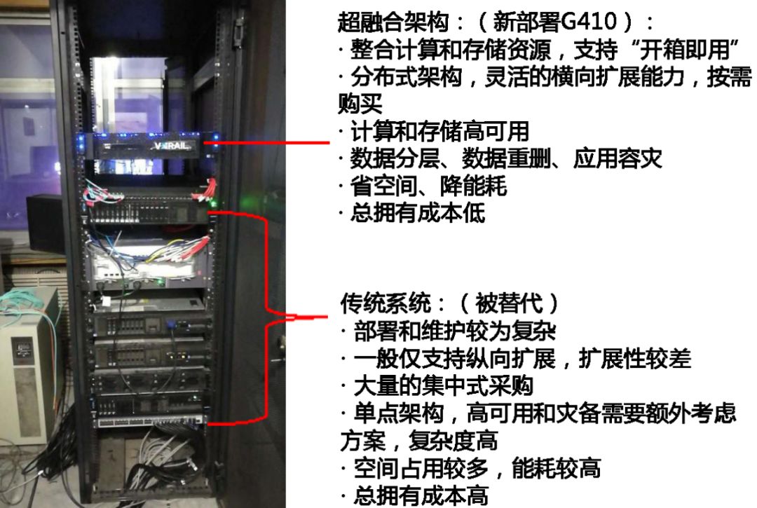 随着IT技术的发展,计算及存储的硬件更新换代特别迅速,处理能力飞速发展,云化,容器化,超融合,全闪存等技术的应用,更使IT基础架构的资源部署更加灵活和高效,机柜布局更加紧凑,设备能耗大幅降低,并在处理能力和扩展性增强的同时,保持了较高的资源使用效率。请看一下对比: