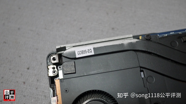 边缘热管的一角贴有一标签,标注GDB55-EQ,依据笔者经验,这应该包含15英寸机型、显卡型号的信息。