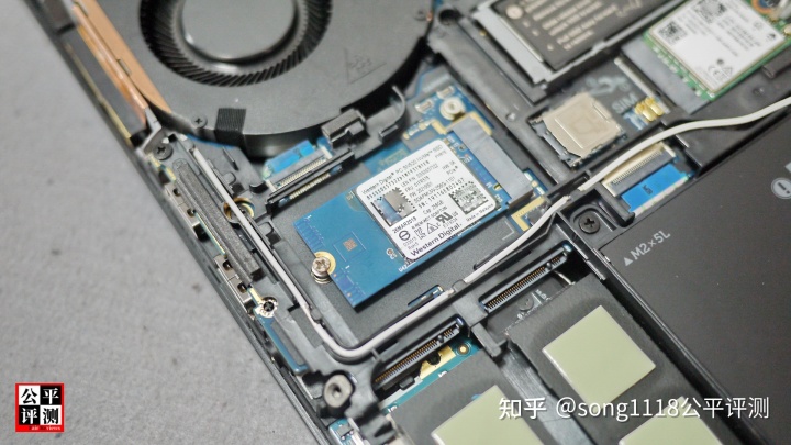 在GPU风扇下方是空置的M.23042 无线广域网(WWAN)卡槽,虽然没有预装WWAN天线,但支持5G的两个天线接口和SIM卡槽完整无缺,如果想后期加装5GWWAN卡,难度不太高。
