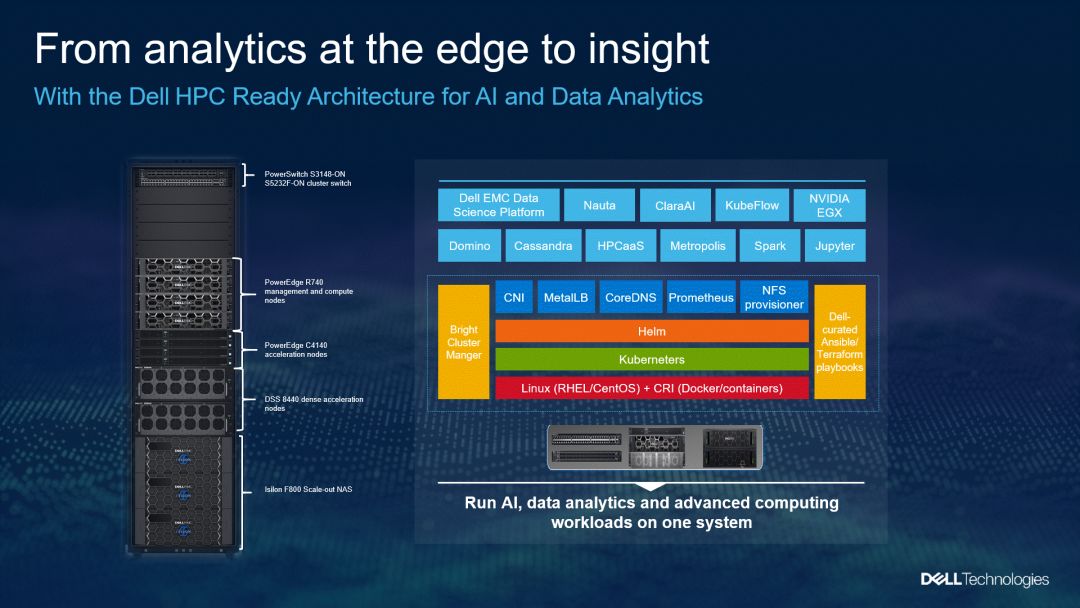 适用于AI和数据分析的戴尔HPC就绪架构通过易于部署的云原生堆栈向边缘提供加速AI计算的能力。Bright Computing® Solution for Edge、戴尔Data Science Portal、配备NVIDIA GPU的PowerEdge服务器和PowerScale横向扩展NAS存储的组合,可以更快地访问在任何地点收集的数据。