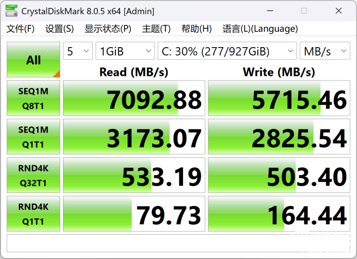 硬盘方面,本机搭载了来自三星的NVMe PCIe 4.0固态硬盘,容量1 TB,在CrystalDiskMark的测试中,连续读写速度分别达到7092 MB/s、5715 MB/s,4K随机读写速度分别为79.73 MB/s、164.44 MB/s,整体表现非常不错,属于Gen4 SSD中的顶流水平,在拷贝大量文件或者载入大型应用程序的时候速度会更快。