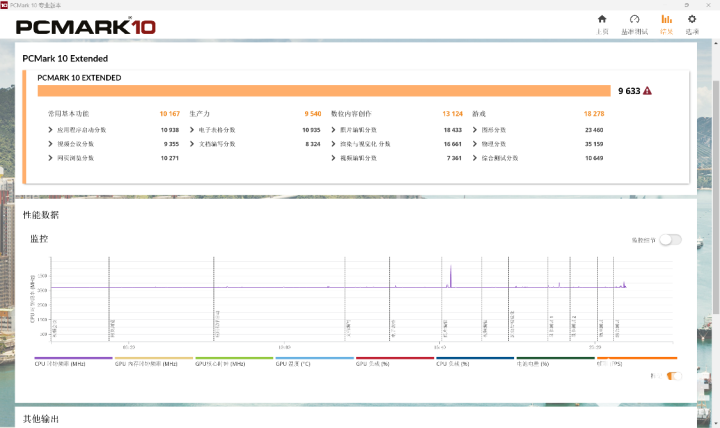 整机性能方面,Dell 16 Premium在PCMark 10 Extended场景的测试中,综合得分高达9633,按照6000分的专业笔记本标准,这已经是远远超出了。其中常用基本功能得分10167分,生产力得分为9540,数位内容创作为13124,甚至游戏子项也有18278分,这意味着这台机器完全能够满足日常办公,照片编辑、视频编辑等各种使用场景。