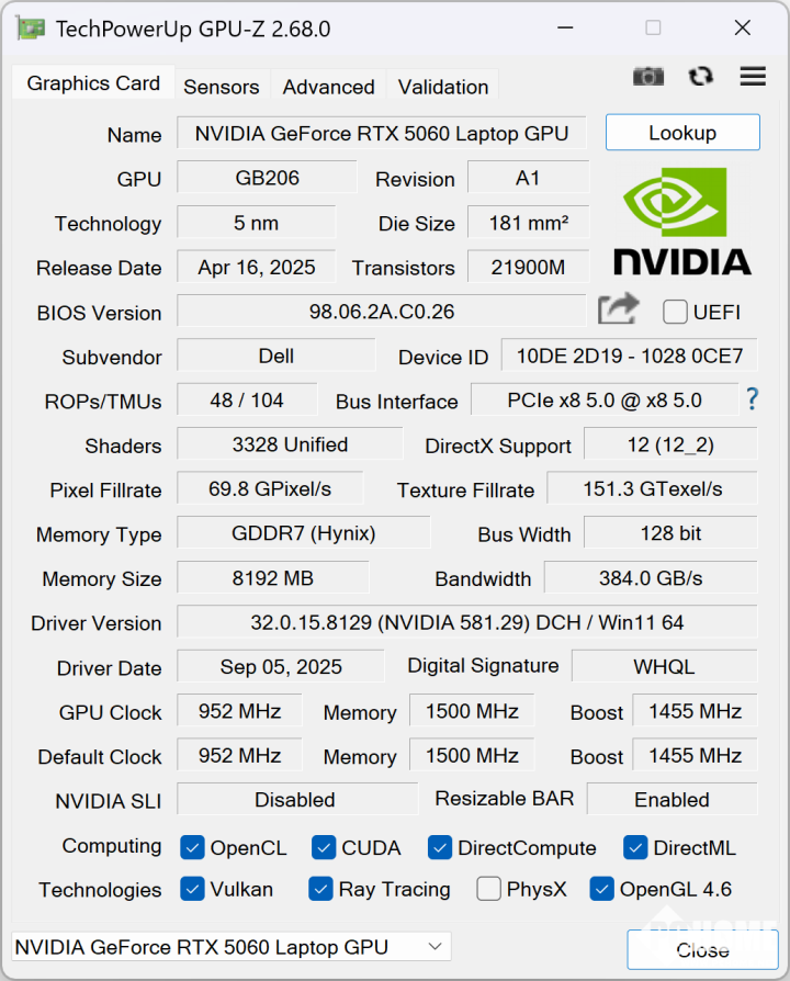 图形性能方面,小编手上的这台Dell 16 Premium搭载了RTX 50系列中的甜品型号RTX 5060,借助NVIDIA Blackwell 架构和DLSS 4 技术,为游戏玩家和创作者带来全新体验。