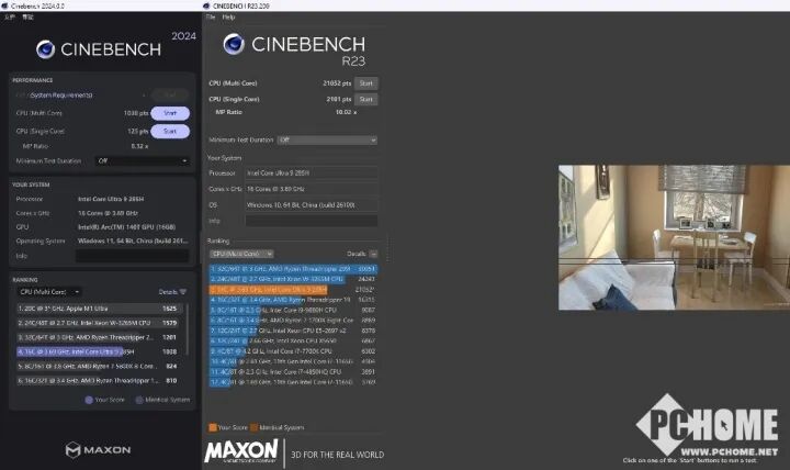 在Cinebench 2024、Cinebench R23两个版本的测试中,Ultra 9 285H在Cinebench 2024的单核成绩为125 pts,多核成绩为1038 pts;在Cinebench R23中的单核成绩为2101 pts,多核成绩为21052 pts。这个成绩已经超过了Intel第12代桌面酷睿i7的水平,能效比还是非常出色的,这也为机器的续航能力打下了基础。