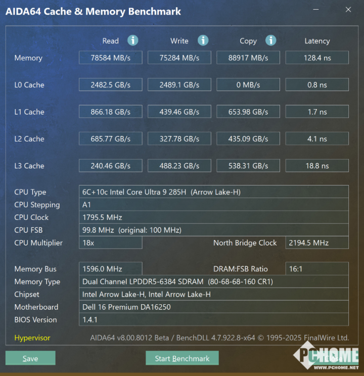 内存方面,该机采用板载32GB、LPDDR5规格,频率达到7467 MT/s。在AIDA64 Cache&Memory Benchmark的测试中,内存读取、写入、复制速度分别为78584 MB/s、75284 MB/s、88917 MB/s,延迟129.4 ns,速度表现出色,不过延迟略高了一点。