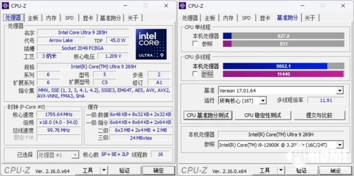 Ultra 9 285H采用N3B制程工艺,拥有16核心16线程,工作最高主频为5.4GHz,三级缓存24MB,多核性能相比上代提升多达20%,标准热设计功耗为45W,最高睿频功耗释放可达115瓦。