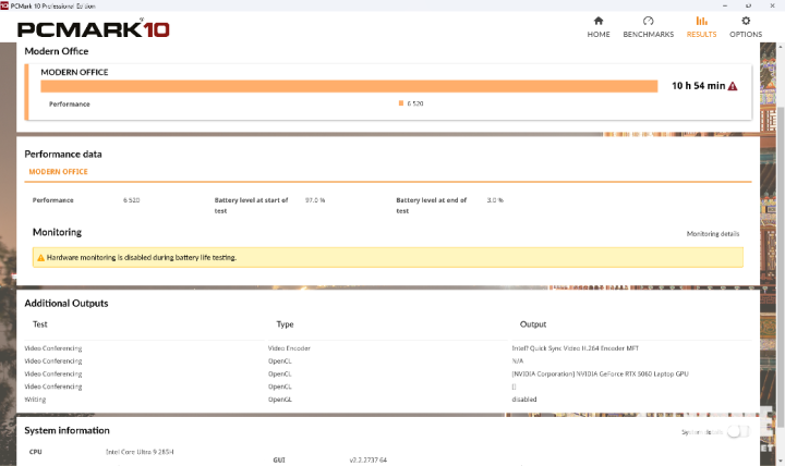 作为一台16.3英寸的大屏笔记本,电池续航能力不免让人担心。但实测结果令人欣喜,Dell 16 Premium在PCMARK 10的现代办公续航测试中可以获得接近11小时的成绩,这是由于该机配备了容量高达99.5 Whr的高密度6芯锂电池,加上酷睿Ultra的出色能效,带来了非常有安全感的移动办公续航能力。