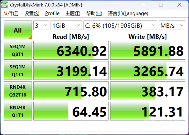 硬盘则是采用的2TB PCIe 4.0 SSD,读取速度为6340.92 MB/s,写入速度为5891.88 MB/s,也是非常不错的数据,在数据传输方面会有更快的表现。